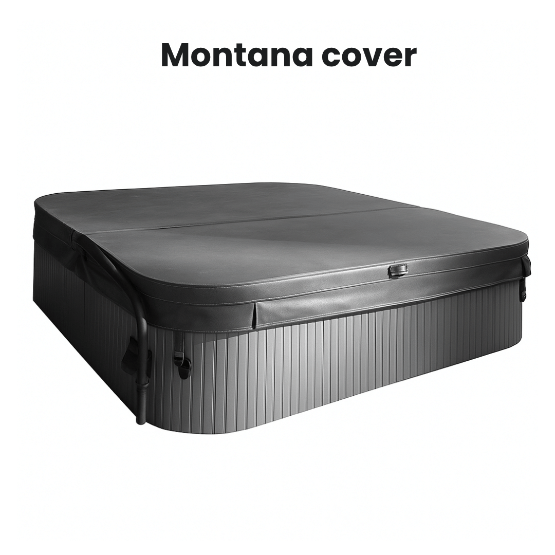 Erstatningscover med stærk læderlignende vinylbetræk. Indsyede håndtag på to sider. Coveret er ekstra tyk og er med til at holde på varmen i karret, især når det er fastgjort med de medfølgende klips, der også fastholder coveret i blæsevejr. Klipsene er forsynet med cifferlås.