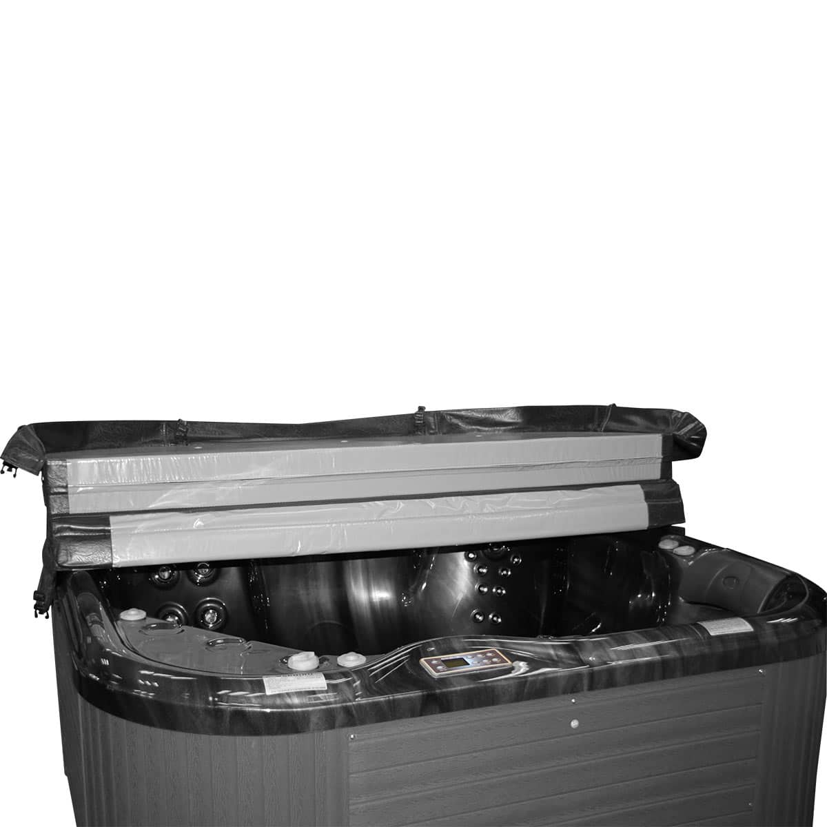 Erstatningscover med stærk læderlignende vinylbetræk. Indsyede håndtag på to sider. Coveret er ekstra tyk og er med til at holde på varmen i karret, især når det er fastgjort med de medfølgende klips, der også fastholder coveret i blæsevejr. Klipsene er forsynet med cifferlås.