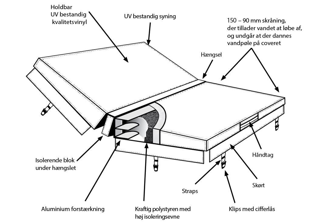 Coveret er ekstra tyk og er med til at holde på varmen i karret, især når det er fastgjort med de medfølgende klips, der også fastholder coveret i blæsevejr. Klipsene er forsynet med cifferlås.